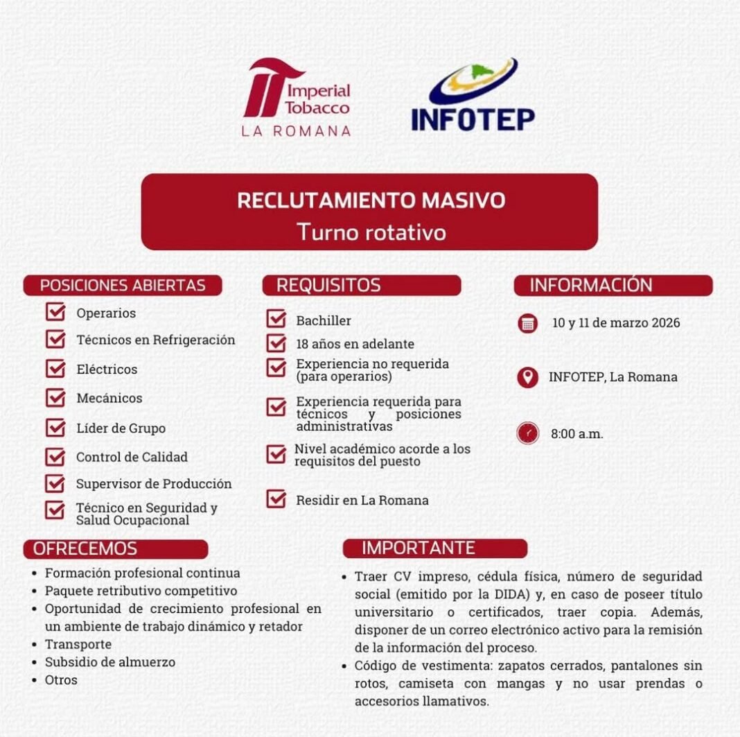 La Romana.– La empresa tabacalera Tabacalera de García realizará un reclutamiento masivo los días 10 y 11 de marzo a partir de las 8:00 de la mañana en las instalaciones de INFOTEP en La Romana.