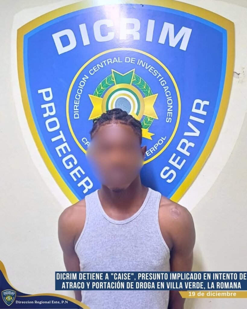 LA ROMANA.– Agentes de la Subdirección Regional Este de Investigaciones Criminales (DICRIM) arrestaron a un joven señalado como presunto implicado en un intento de atraco, además de ocuparle varias porciones de una sustancia presumiblemente narcótica, durante un operativo realizado en el sector Villa Verde, de esta ciudad.